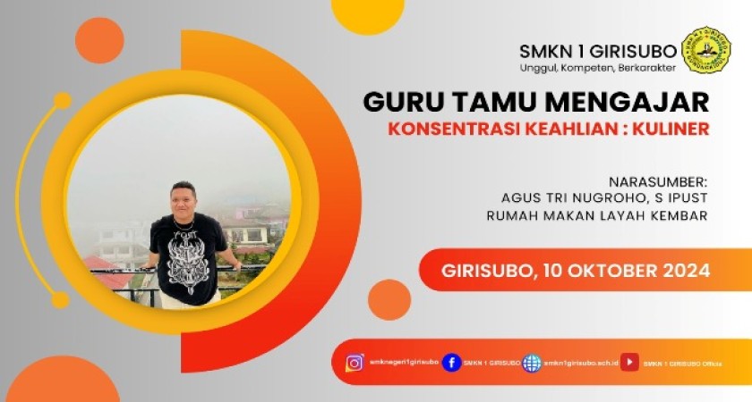 Girisubo, 10 Oktober 2024 – Suasana antusiasme menyelimuti ruang praktik kuliner SMKN 1 Girisubo hari ini. Pasalnya, siswa-siswi konsentrasi keahlian kuliner mendapat kesempatan langka untuk belajar langsung dari Agus Tri Nugroho, S.Ipust, seorang ahli kuliner yang berpengalaman dari Rumah Makan Layah Kembar.